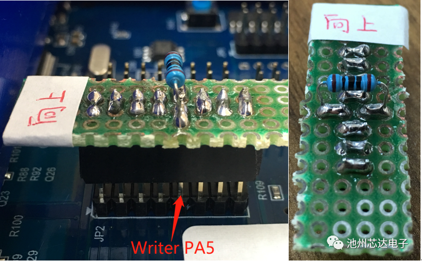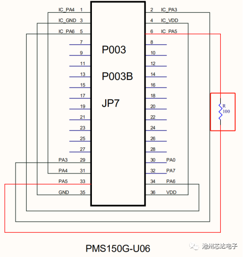 2.若燒錄U06封裝的IC,請在JP7的PA5引腳處串一個100?的電阻,連接方式如下圖: