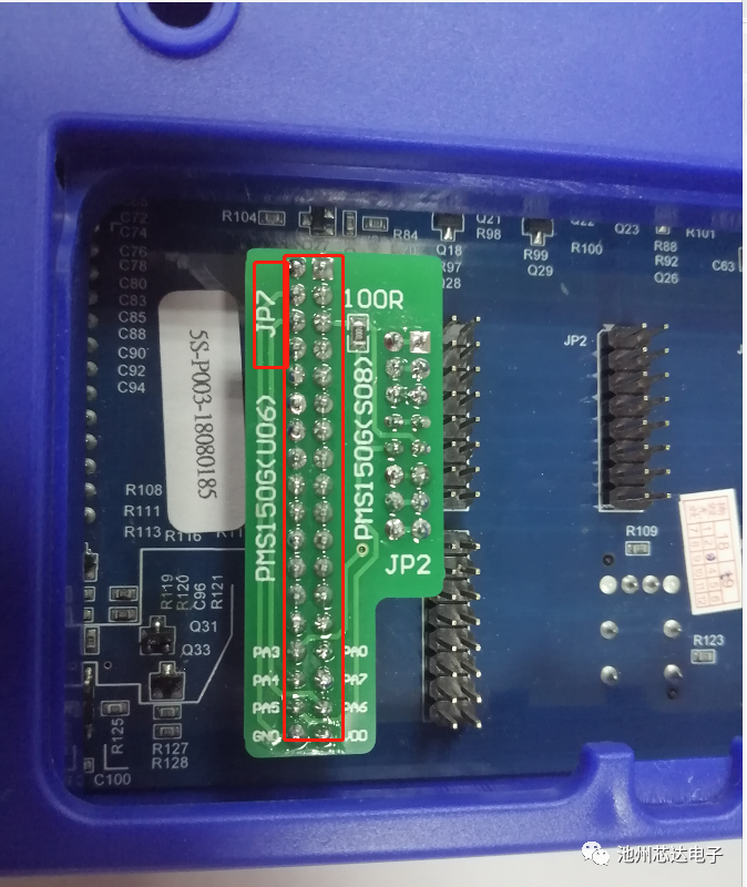 以PMS150G-S08為例,為提升IC批量燒錄的穩定性及可靠性,燒錄前,請在Writer背后JP2的PA5引腳上串一個100?的電阻。連接方式參考如下圖: